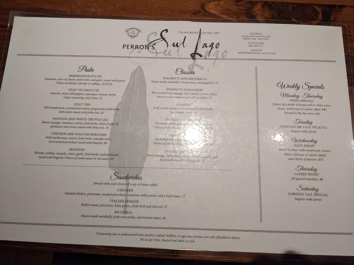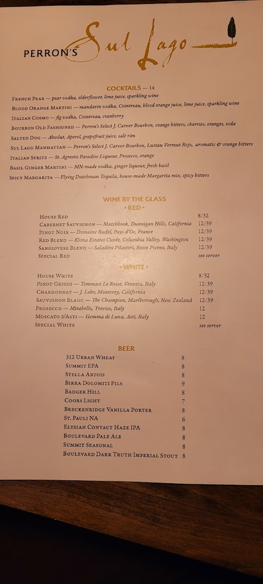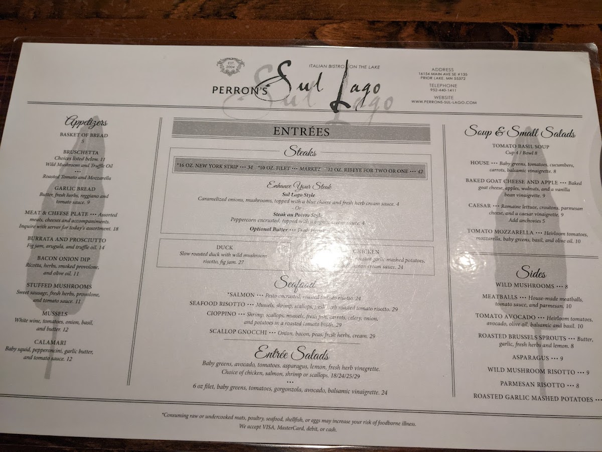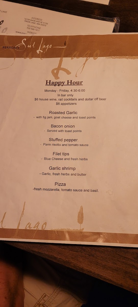 Welcome to Perron's Sul Lago, a hidden gem located in the charming town of Prior Lake, Minnesota. This quaint restaurant offers a delightful culinary experience that keeps guests coming back for more. The menu boasts an impressive selection of dishes, ensuring there's something for every palate.